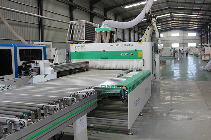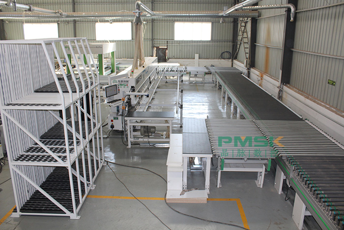 數控開料機連線,逐步增加中間相連接的設備,如開料設備、多軸搬運機器人、封邊回轉線系統、動力傳輸線、龍門抓料機、