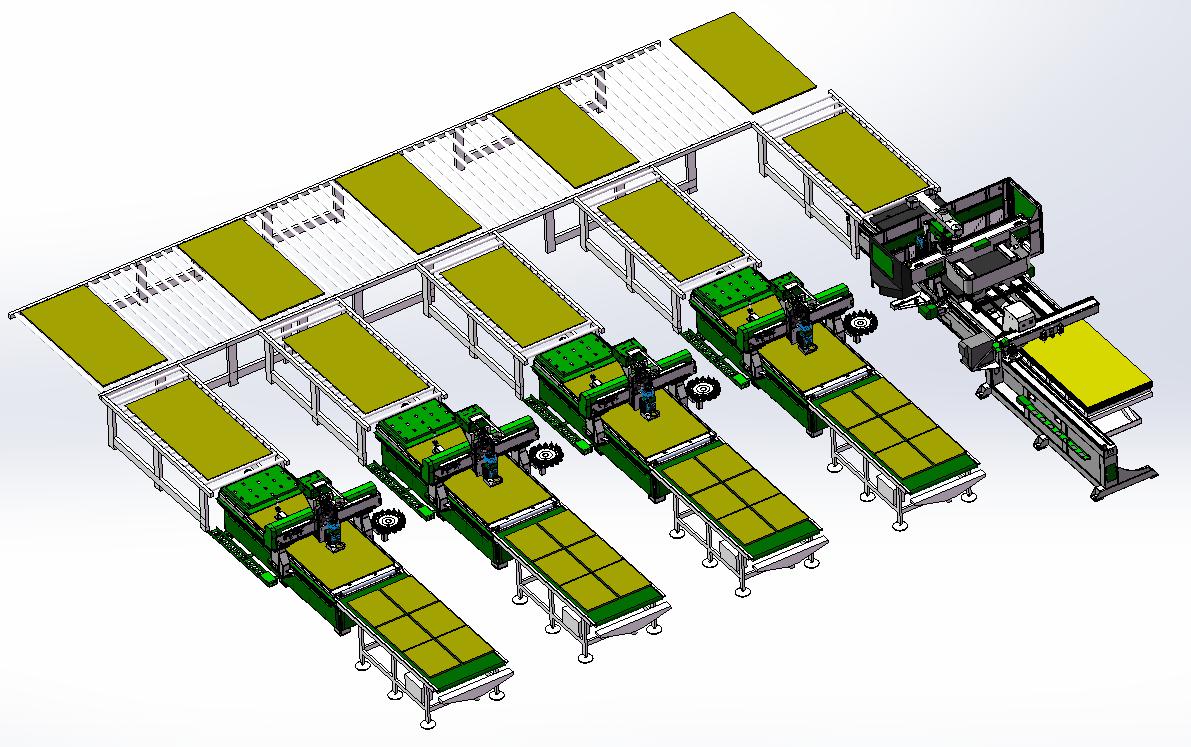整體的步驟如下:叉車上料--自動貼標打標簽--機器抓料上臺面打絞鏈孔、打孔、拉直器槽、玻璃門背面加工--傳輸到翻板機翻板--自動傳輸到門型加工中心--加工門型并切割--加工完推到出料平臺并同時上料