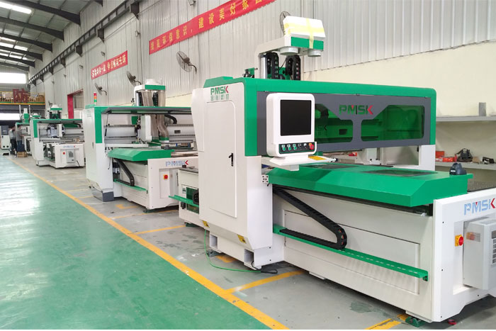 品脈數控定制家具工業4.0智能生產線主要是以無人化工廠為主,打造工業4.0的生產連線,把開料、封邊、鉆孔、分揀、包裝等流程一體化,從而實現無人式的工廠生產模式。整套定制家具工業4.0硬件部分涵蓋開料設備、多軸搬運機器人、封邊回轉線系統、動力傳輸線、龍門抓料機、六面鉆打孔設備、自動分揀系統等通過總控系統與智能軟件控制實現自動化生產。 品脈數控開料機: 數控六面鉆